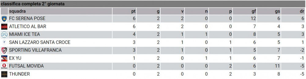 L'altra capolista, l'ATLETICO AL BAR supera per una rete di scarto gli EX YU. Un 5 a 4 dettato dalle doppiette di Lovo Andrea e Pagano Dario oltre al goal di Pilotto Matteo. Per gli EX YU hanno risposto Tomic Nenad con una tripletta e Vasic Marko. Attualmente, da segnalare che l'ATLETICO AL BAR ha la miglior difesa del campionato con 4 reti subite in due match.I MIAMI ICE TEA dopo il pareggio nella prima giornata con l'EX YU si confeziona il primo successo stagionale contro i THUNDER. La tripletta di Canil Michael e le reti di Cosma Davide, Lazzari Alex e Santi Michael danno forma ad un 3 a 6 che li tiene in scia delle due battistrada. Per i THUNDER dopo essere stati a secco di reti nella prima uscita stagionale, in questa giornata si sono sbloccati con le realizzazioni di Alessi Luca, Bragagnolo Mattia e Dotto Matteo.
