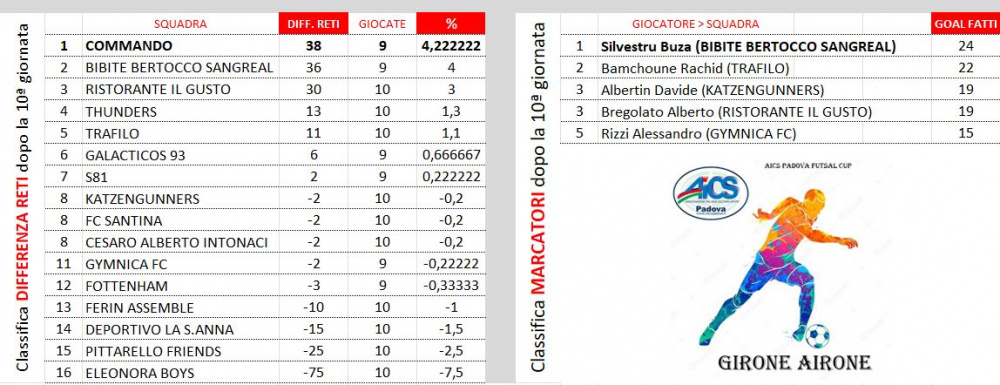 Il piede caldo nel Girone AIRONE ce lo ha Silvestru Buza dei BIBITE BERTOCCO SANGREAL, con 24 centri, seguito a ruota da Bamchoune Rachid dei TRAFILO con 22 sigilli, mentre Albertin Davide dei KATZENGUNNERS e Bregolato Alberto del RISTORANTE IL GUSTO si contendono la 3^ piazza con 19 reti a testa, davanti a Rizzi Alessandro dei GYMNICA FC che può contare su 15 centri.