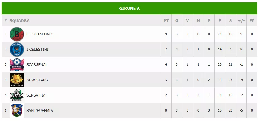 Il Girone A si spacca in due. Se il BOTAFOGO corre per il titolo e I CELESTINI restano l'unica vera alternativa, la bagarre per il terzo posto tra SCARSENAL, NEW STARS e SENSA FIA' promette di risolversi solo all'ultimo secondo dell'ultima giornata.