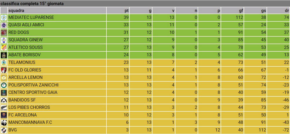 E con questa sono 13 vittorie su altrettante partite per l'imbattibile corrazzata MEDIATEC LUPARENSE (39 punti). Le triplette di Baldan Andrea e Djordjevic Vladan, le doppiette di Radojicic Marjan e Soncin Andrea e la rete del giovane talento Piazza Pietro chiudono il match sull'11 a 4 contro i BVG (3 punti) che comunque hanno portato sul linoleum del Vertigo un calcio a 5 di ottimo livello con giocate chirurgiche che hanno messo a dura prova la reattività tra i pali di Signorelli Daniele, un portiere che non ha bisogno di presentazioni. Gli unici a scardinare la porta dei primi della classe sono stati l'ottimo Bacco Giovanni e Buompane Michele con una doppietta a testa.