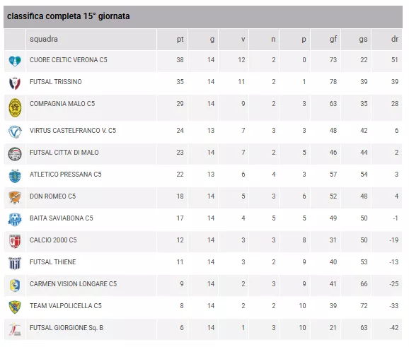 CARMEN VISION LONGARE C5 - CUORE CELTIC VERONA C5 = Venerdì 23/01/2026 21:30 (And.: 0 a 7)