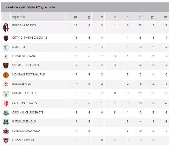 In testa, il BOLOGNA FC 1909 di Mister Nobile Simone continua la sua marcia trionfale e inarrestabile, imponendosi contro il CALCIO PADOVA C5 per 6 a 1. Protagonista assoluta una scatenata Paolucci Debora con un poker, affiancata dalle reti di Aligante Luisa e Filippini Saron. Un monologo offensivo che ha trafitto il portiere del PADOVA, Pilloni Francesca, nonostante l'unica, orgogliosa marcatura di Elena Stefani Elena per la squadra di Mister Parisi Emanuele e Facino Sonia. Il Bologna consolida il primato con 16 punti.