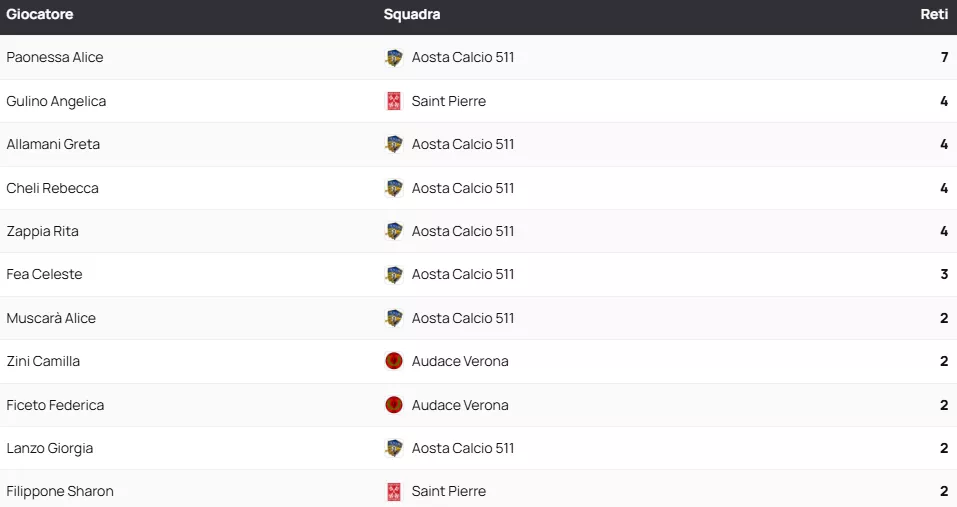Aosta Calcio 511: Paonessa Alice (4), Fea Celeste (2), Zappia Rita (2), Muscarà Alice (2), Fea Celeste - Mister: Calli Tiago - Rosa Rodrigo
