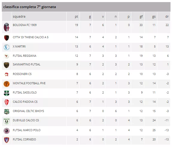 Sabato 8 e Domenica 9 novembre si è disputata la Settima Giornata del Campionato di Serie C FEMMINILE al termine della quale ha visto il BOLOGNA FC 1909 allungare in classifica grazie al pareggio del CITTA' DI THIENE CALCIO A 5, che ora deve guardarsi dietro per l'avvicinamento del X MARTIRI vittorioso sul SANMARTINO FUTSAL. Dietro pareggiano le ORIGINAL CELTIC BHOYS e il CALCIO PADOVA C5. Fattore campo in perfetto equilibrio, con due vittorie casalinghe, due pareggi e due sconfitte. Sono 34 le reti segnate, 14 dalle squadre di casa e 20 da quelle in trasferta.