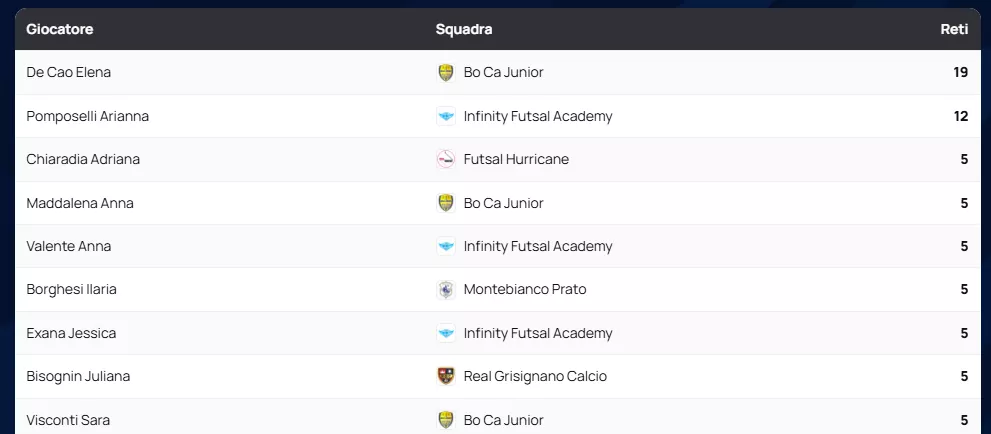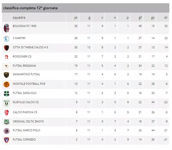 Sabato 13 e Domenica 14 novembre si è disputata la Dodicesima Giornata del Campionato di Serie C FEMMINILE conferma che il girone è diviso attualmente in tre fasce. Quella delle prime quattro, con le prime tre in due punti e la quarta a cinque punti dalla vetta. La seconda fascia, quella della parte centrale con quattro squadre in sette punti e la fascia bassa, con cinque squadre in sette punti. Continua la corsa appaiata tra BOLOGNA FC 1909 e X MARTIRI con il CITTA' DI THIENE CALCIO A 5 staccato di due punti ma con una partita in più. Il fattore campo non è determinante, infatti sono due le vittorie casalinghe, due i pareggi e due le vittorie esterne. Sono 33 le reti realizzate, 20 dalle squadre di casa e 13 da quelle in trasferta.
