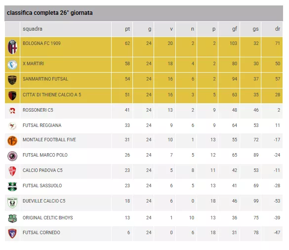 1ª BOLOGNA FC 1909 - 4ª CITTA' DI THIENE C5 = Se il distacco tra le squadre 1^ e 4^ classificata è pari o superiore a 7 punti l'incontro di Semifinale non verrà disputato e la Società 1^ classificata: BOLOGNA FC 1909 passa al turno successivo.