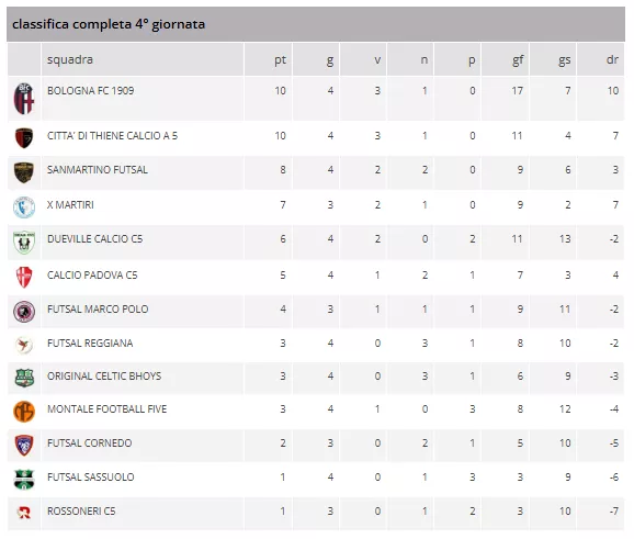 Sabato 18 e Domenica 19 ottobre si è disputata la Quarta Giornata del Campionato di Serie C FEMMINILE al termine delle quale BOLOGNA FC 1909 e CITTA' DI THIENE rimangono prime in classifica nonostante i pareggi ottenuti. Si porta al quarto posto il X MARTIRI. In questa giornata sono state siglate 24 reti, 11 dalle squadre di casa e 13 da quelle in trasferta che hanno fruttato due vittorie interne, due pareggi e due vittorie esterne.