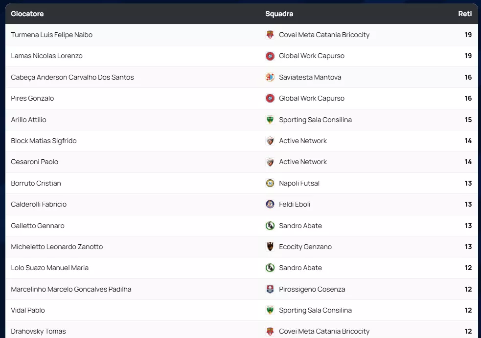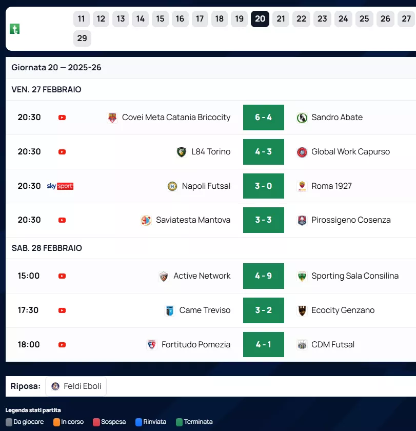 Inarrestabile la marcia della capolista Covei Meta Catania Bricocity, che consolida il primato a quota 47 punti dopo lo spettacolare 6 a 4 inflitto al Sandro Abate. Gli etnei si confermano il miglior attacco del torneo con ben 94 reti segnate. Al secondo posto scalpita l'L84 Torino, uscita vittoriosa per 4 a 3 contro il Global Work Capurso, vantando inoltre la difesa più impermeabile del campionato con sole 39 reti subite.