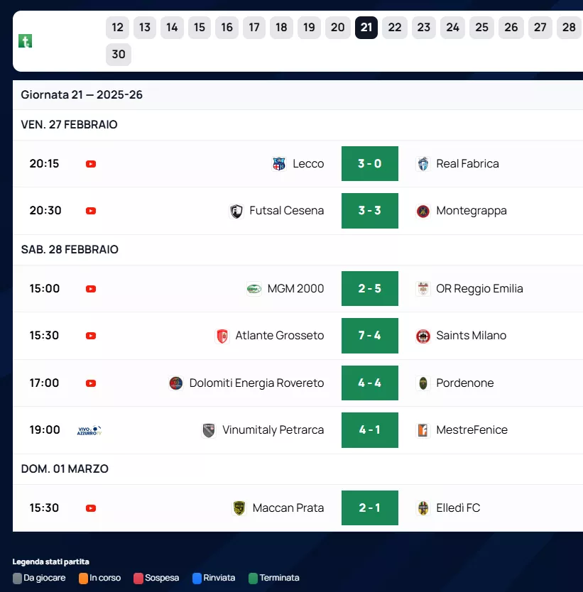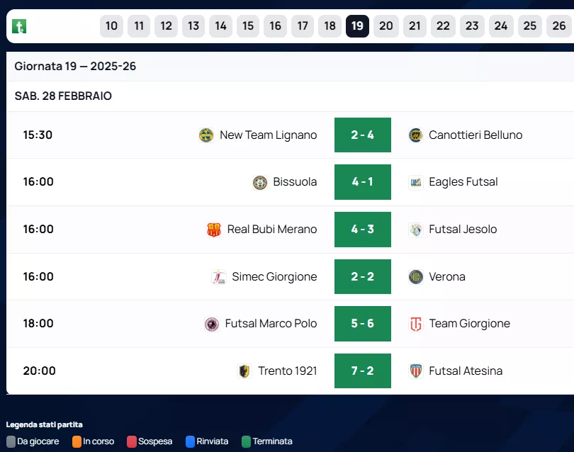 A metà classifica, l'Eagles Futsal (25 punti) e il Real Bubi Merano (22 punti) mantengono un margine di sicurezza, con i meranesi reduci da una preziosa vittoria per 4 a 3 sul Futsal Jesolo. In nona posizione troviamo la Canottieri Belluno, che espugna il campo della New Team Lignano per 2 a 4 e sale a 19 punti.