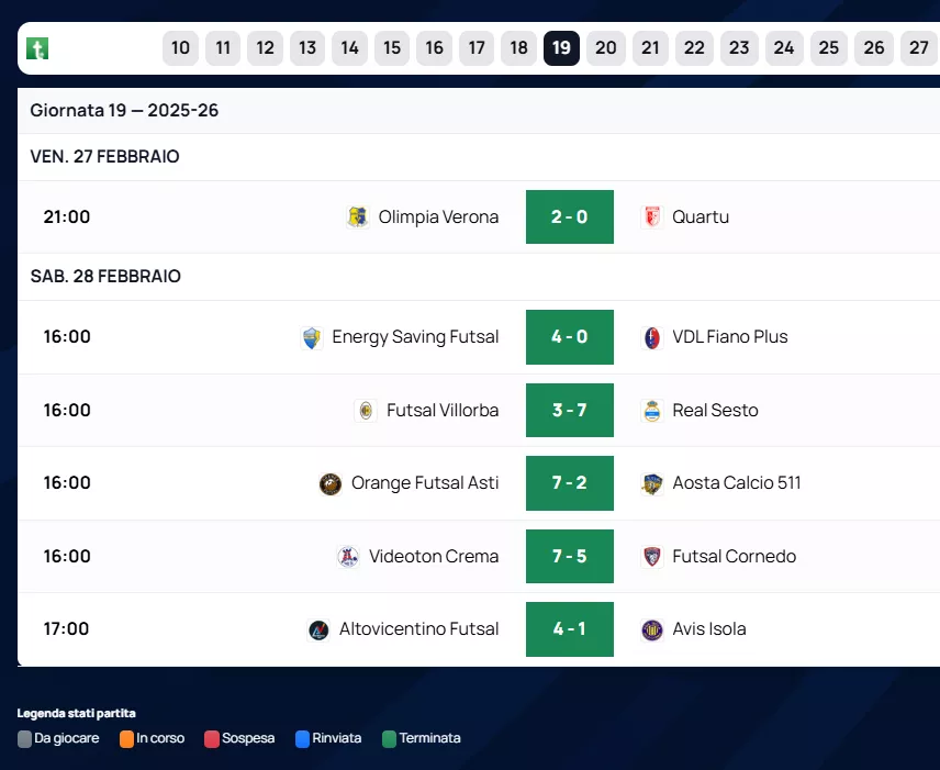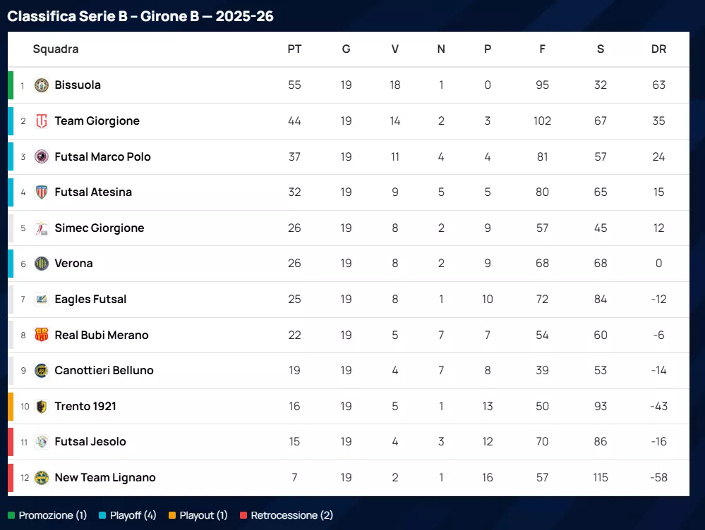 Il quarto posto è occupato dal Futsal Atesina (32 punti), travolto però per 7 a 2 da un Trento 1921 in cerca di punti salvezza. A chiudere la zona Playoff troviamo il Simec Giorgione a quota 26 punti, che ha strappato un pareggio per 2 a 2 nello scontro diretto contro il Verona, attualmente sesto e prima squadra fuori dagli spareggi promozione per la differenza reti.