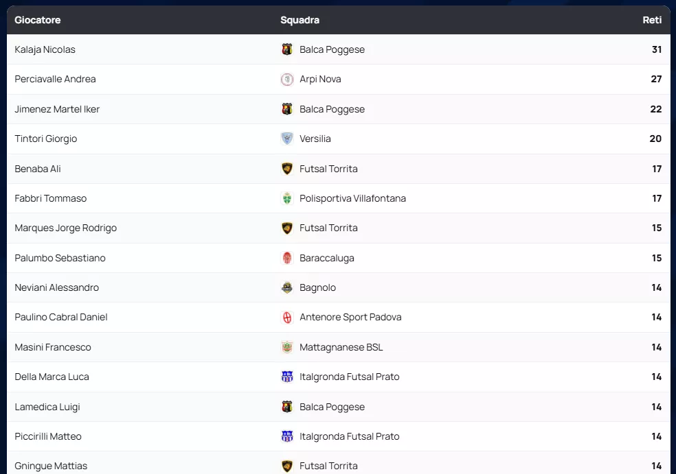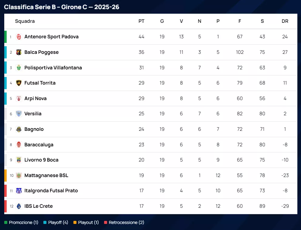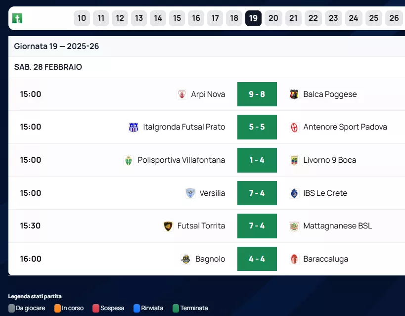 Alle loro spalle, la Balca Poggese si conferma una vera macchina da guerra offensiva: nonostante la sconfitta per 9 a 8 in un match pirotecnico contro l'Arpi Nova, resta la squadra con più reti segnate del campionato, ben 102 gol. Al terzo posto troviamo la Polisportiva Villafontana (31 punti), fermata in casa per 1 a 4 da un ottimo Livorno 9 Boca.