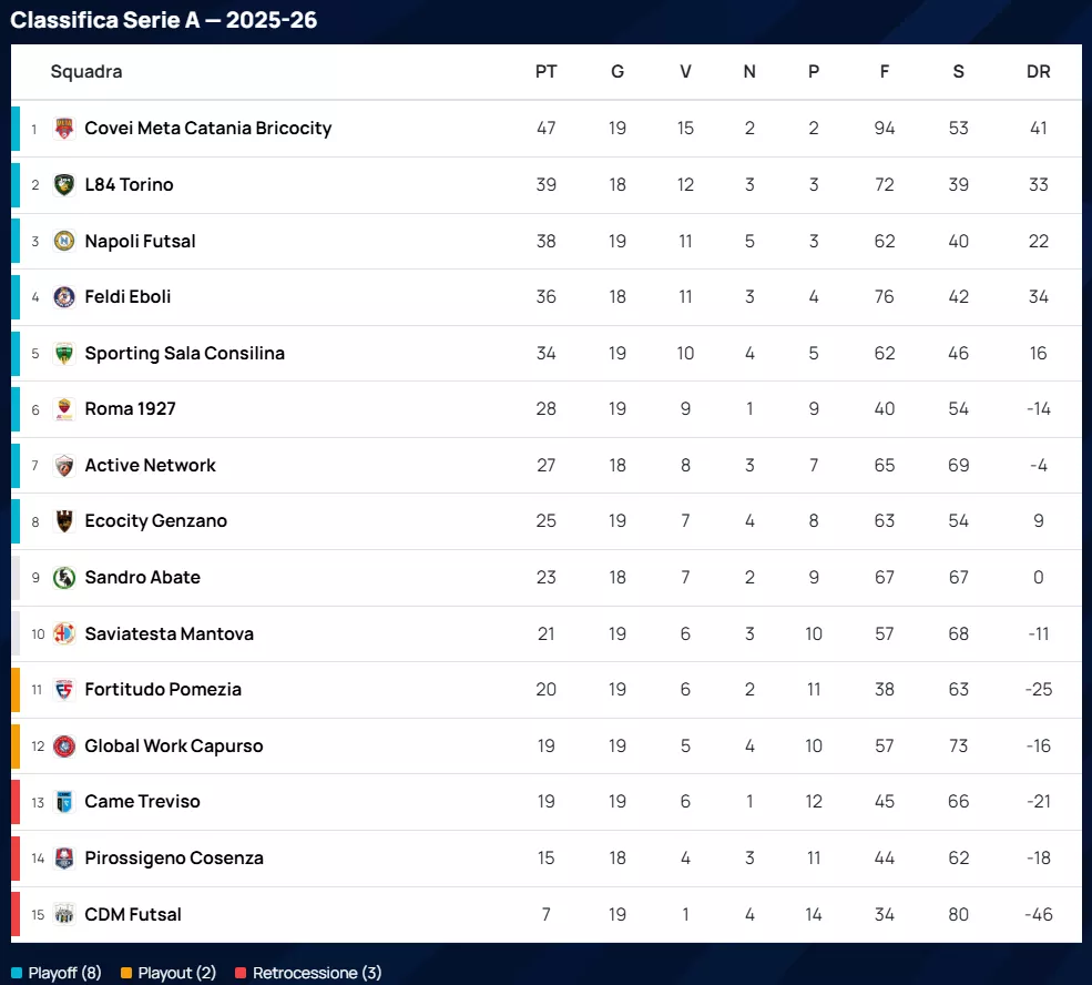La zona calda vede il Quartu occupare attualmente la decima posizione con 18 punti, che significherebbe lo spareggio Play Out. In una situazione ancora più delicata si trova il Futsal Villorba, undicesimo a 14 punti dopo la sconfitta interna contro il Real Sesto, anch'esso destinato ai Play Out se la classifica rimanesse invariata.