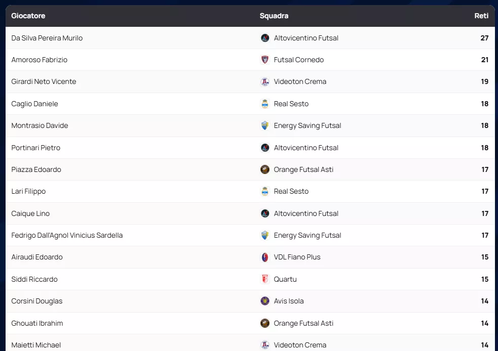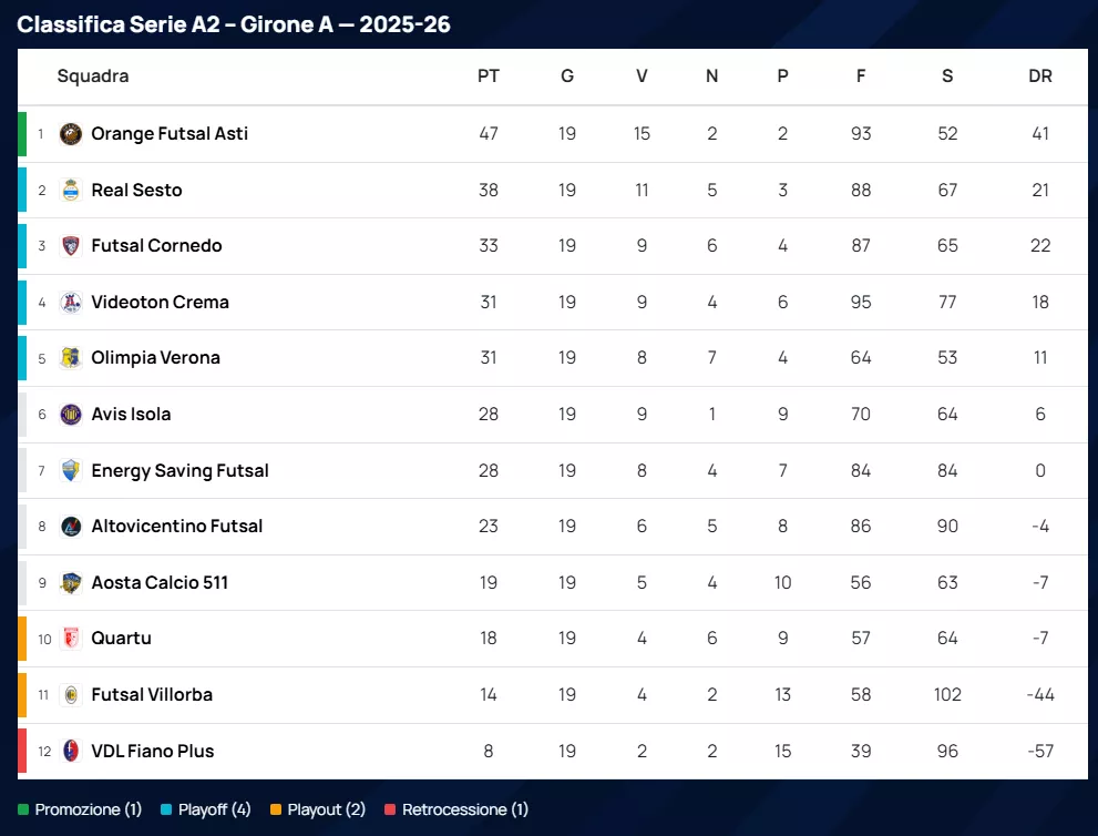 L'Orange Futsal Asti continua la sua marcia trionfale verso la Serie A2 Élite, schiantando l'Aosta Calcio 511 con un netto 7 a 2. Con 47 punti e un vantaggio rassicurante, la capolista si conferma anche la difesa più solida del torneo con sole 52 reti subite.