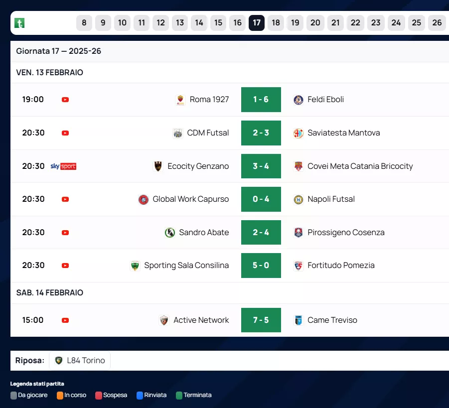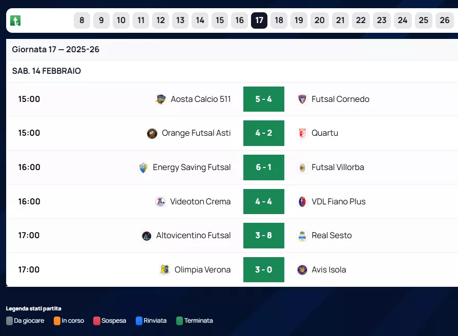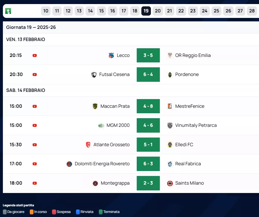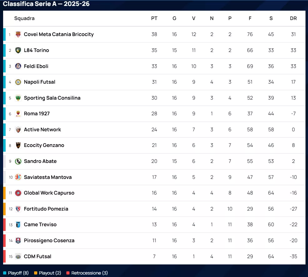 Dolomiti Energia Rovereto: Successo solido contro il Real Fabrica (6 a 3), utile per consolidare la sesta piazza a 28 punti.