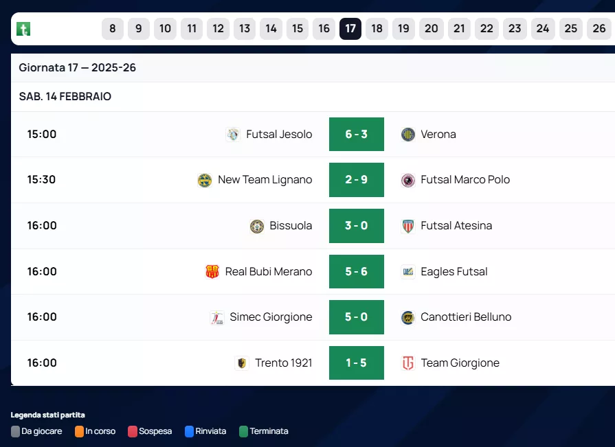 Il Bissuola non si ferma più. Con una vittoria autoritaria per 3 a 0 contro il Futsal Atesina, la capolista vola a 49 punti, mantenendo l'imbattibilità stagionale dopo 17 gare (16 vittorie e un solo pareggio). I numeri della capolista sono spaventosi: vanta la miglior difesa del campionato con soli 30 gol subiti e un attacco da 87 centri.