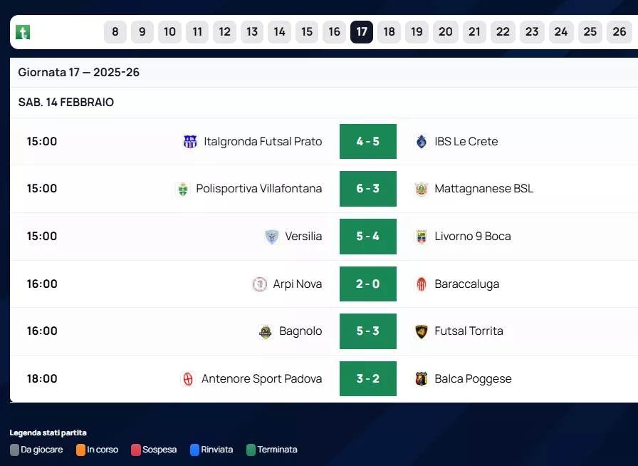 Da segnalare l'importante blitz esterno dell'IBS Le Crete, che espugna il campo dell'Italgronda Futsal Prato per 5 a 4. In coda, la situazione resta drammatica per Italgronda Futsal Prato e Mattagnanese BSL, entrambe ferme a 16 punti in piena zona retrocessione.