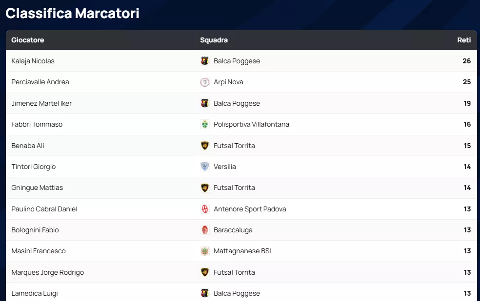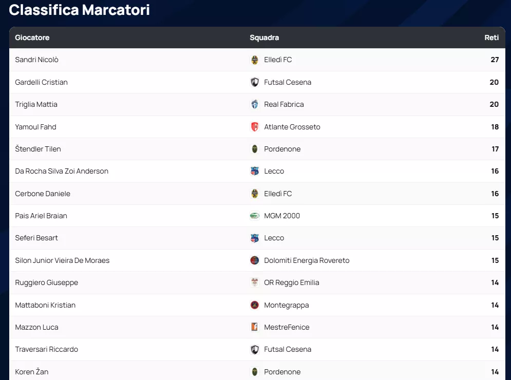 In fondo alla classifica, resta critica la situazione del New Team Lignano, fanalino di coda con soli 7 punti e la peggior difesa del torneo (106 reti subite).