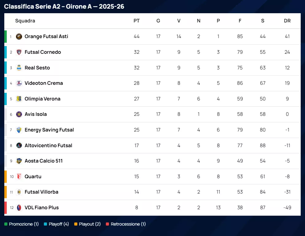 L'ORANGE FUTSAL ASTI viaggia ormai a velocità doppia rispetto al resto del gruppo. Con 14 vittorie su 17 gare e la miglior difesa del torneo, il traguardo sembra vicinissimo. Dietro, la lotta tra Real Sesto e Futsal Cornedo per la piazza d'onore e il risveglio dell'Olimpia Verona garantiscono un finale di stagione elettrizzante.