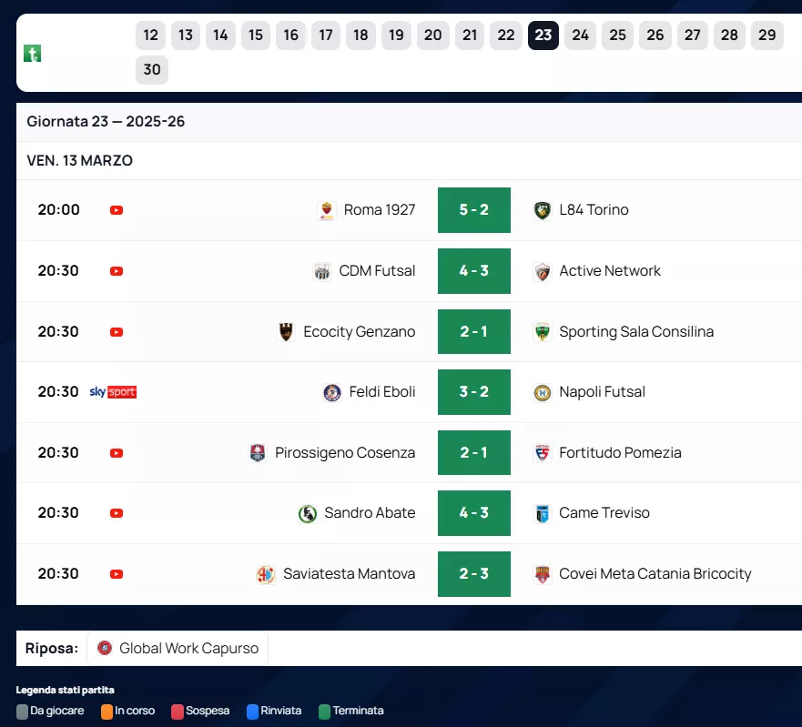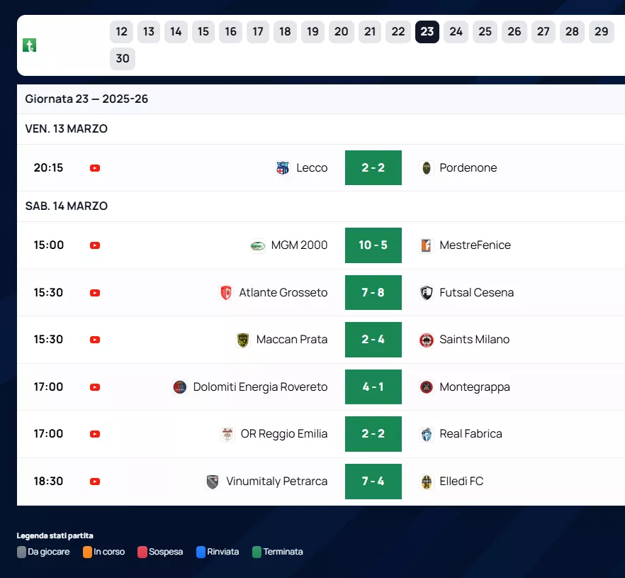 Serie A: L'emozione del calcio a 5 entra nel vivo con la ventitreesima giornata della Serie A 2025/26. Quando mancano ormai solo sette rintocchi al termine della regular season, ogni pallone scotta e ogni centimetro di parquet può valere una stagione. La classifica si spacca in due: da un lato la corsa per un piazzamento privilegiato nei Play Off, dall'altro l'incubo della retrocessione diretta e la trappola dei Play Out.
