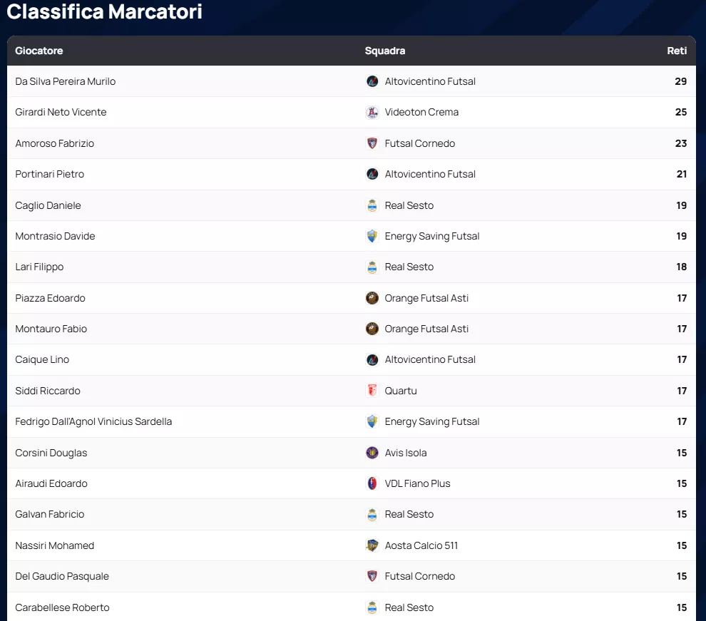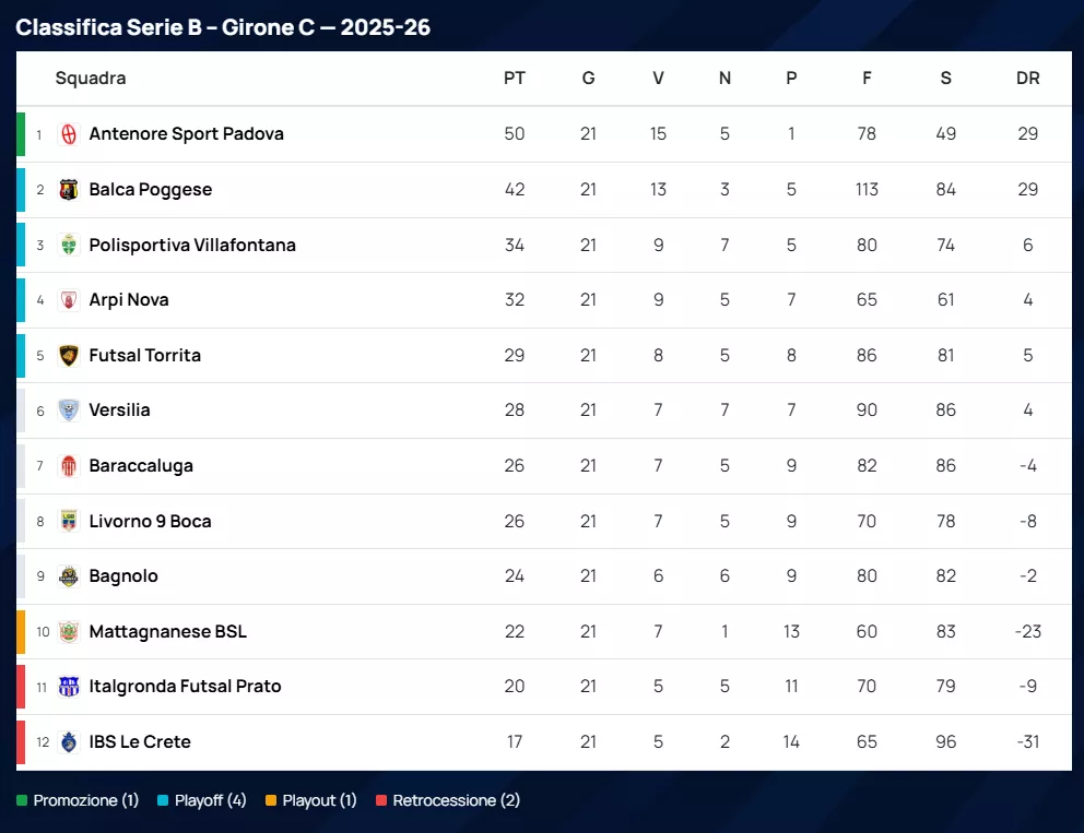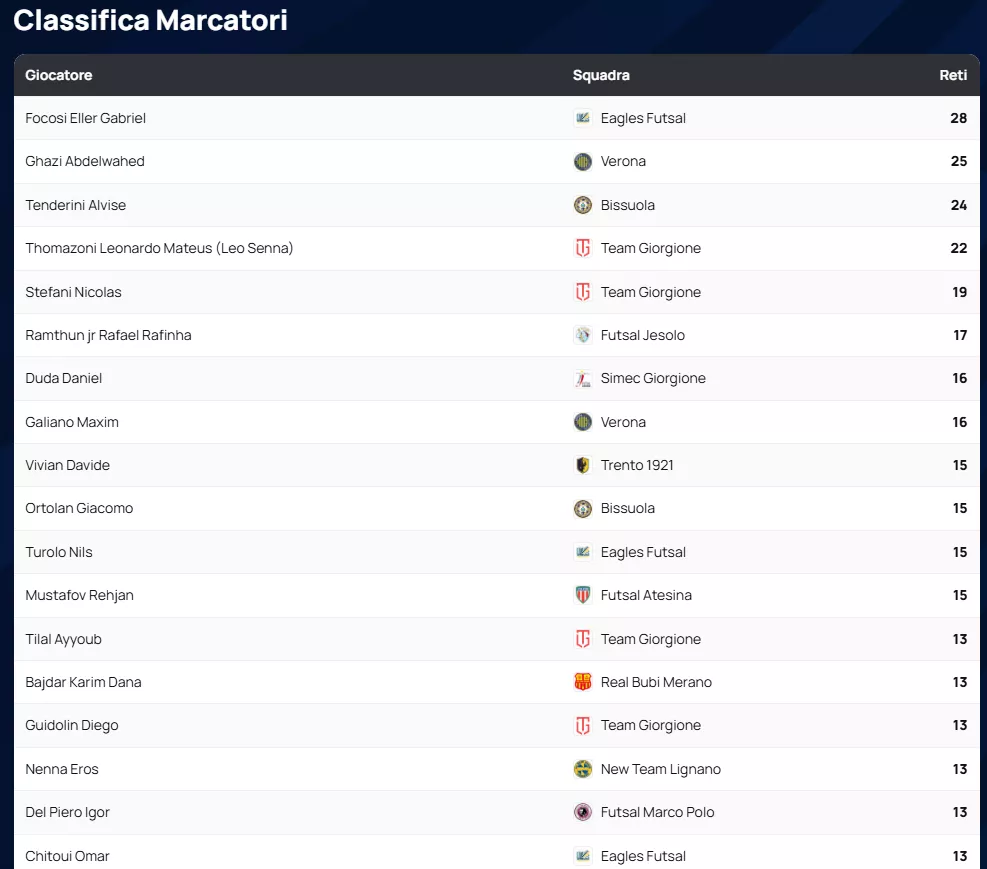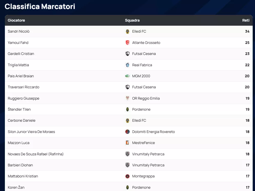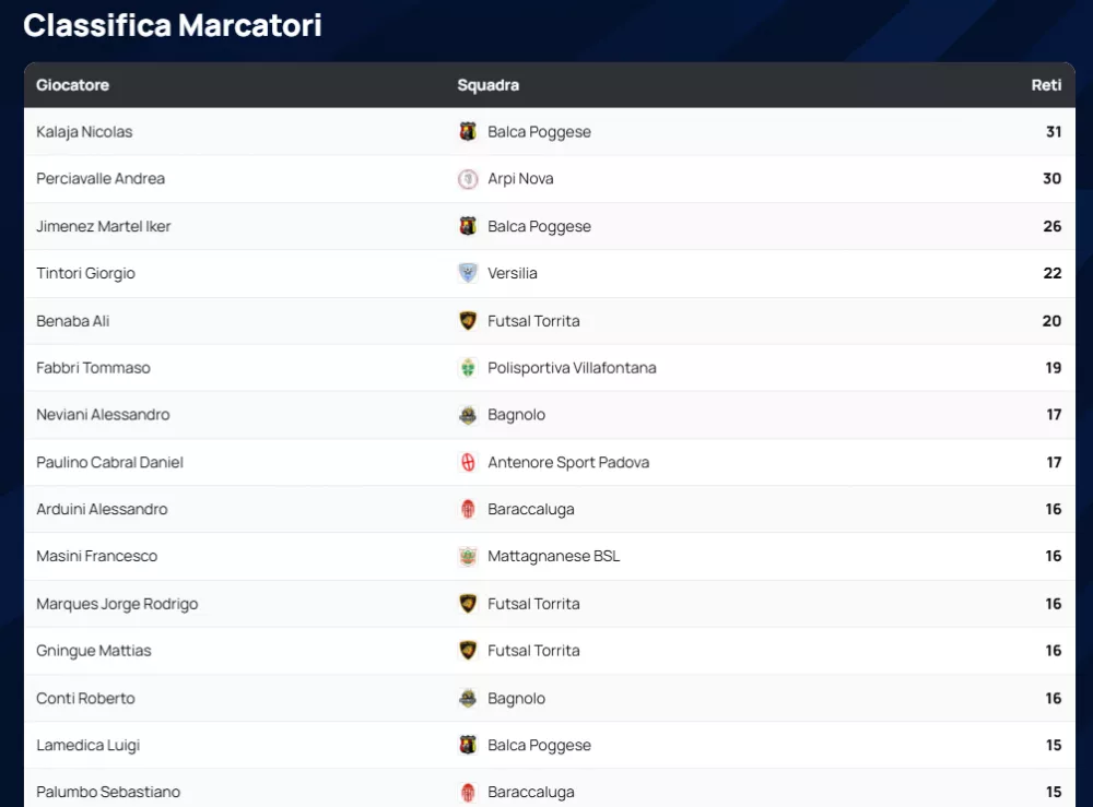 Dando uno sguardo ai numeri che hanno infiammato il parquet, la Balca Poggese si conferma una vera macchina da guerra offensiva, risultando la squadra con più reti segnate con ben 113 centri. Sul versante opposto, la solidità difensiva dell'Antenore Sport Padova è stata la chiave del successo: sono loro la squadra con meno reti subite, avendo concesso appena 49 gol agli avversari.