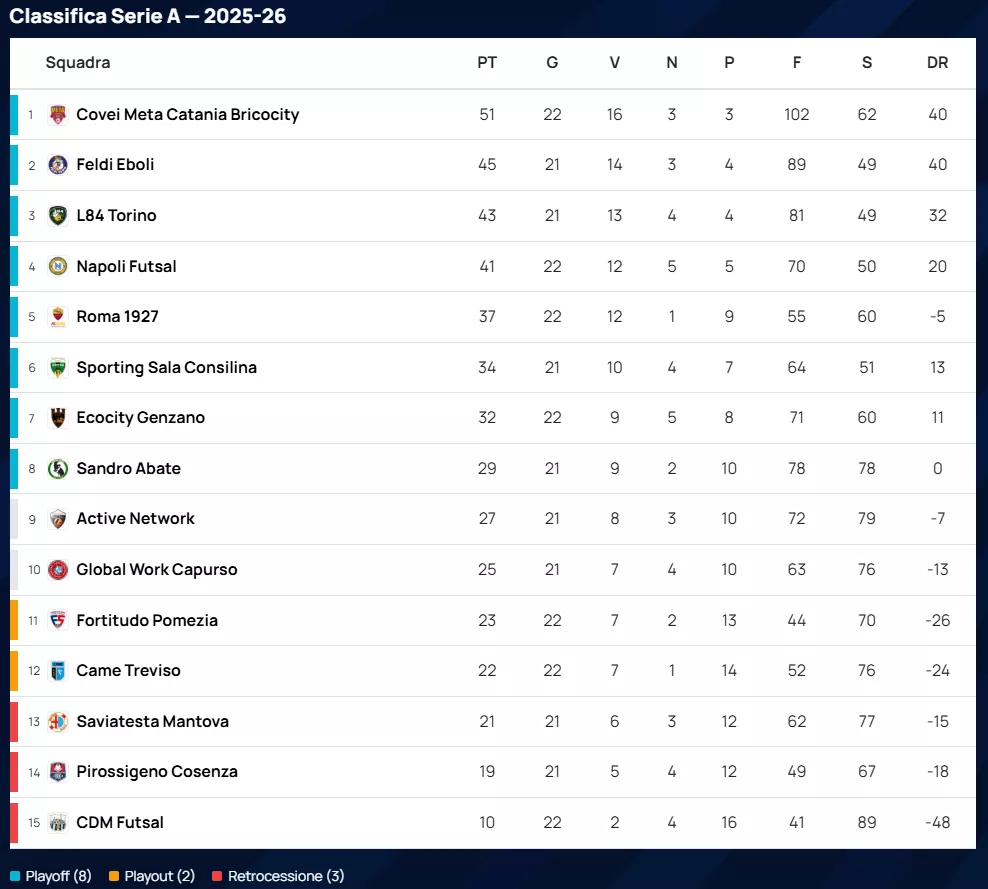 La zona calda vede il Quartu (19 punti) e il Futsal Villorba (17 punti) attualmente destinati alla rischiosa sfida dei Play Out. Per il Villorba, il pesante stop interno contro il Cornedo complica i piani di salvezza diretta. Il verdetto più triste è però quello del VDL Fiano Plus, che dopo la disfatta contro il Real Sesto resta inchiodato a 8 punti e retrocede matematicamente in Serie B con un turno d'anticipo.
