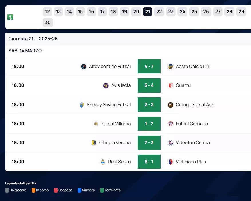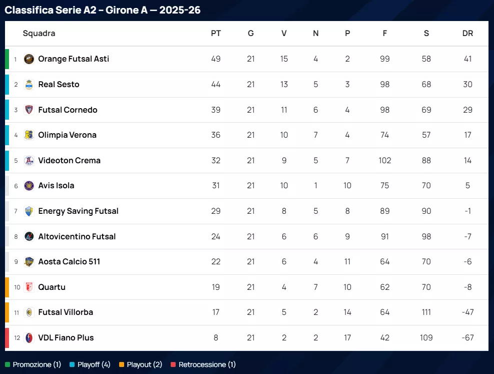 Serie A2 Girone A: emette il suo verdetto più importante con novanta minuti di anticipo: l'ORANGE FUTSAL ASTI è ufficialmente promosso in SERIE A2 Élite. In un campionato dove ogni gol ha pesato come un macigno, i numeri incoronano il Videoton Crema come la squadra con più reti segnate con 102 centri, mentre l'Olimpia Verona si distingue per la miglior tenuta difensiva, risultando la squadra con meno reti subite con soli 57 gol al passivo.