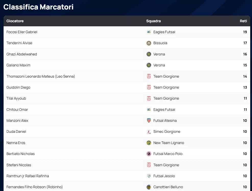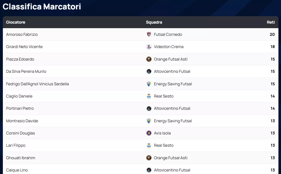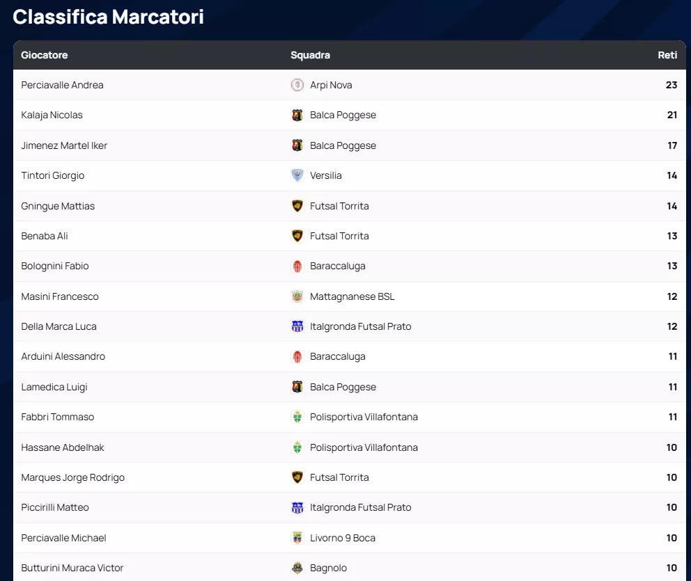 Classifica Marcatori SERIE A2 Élite Gir. A