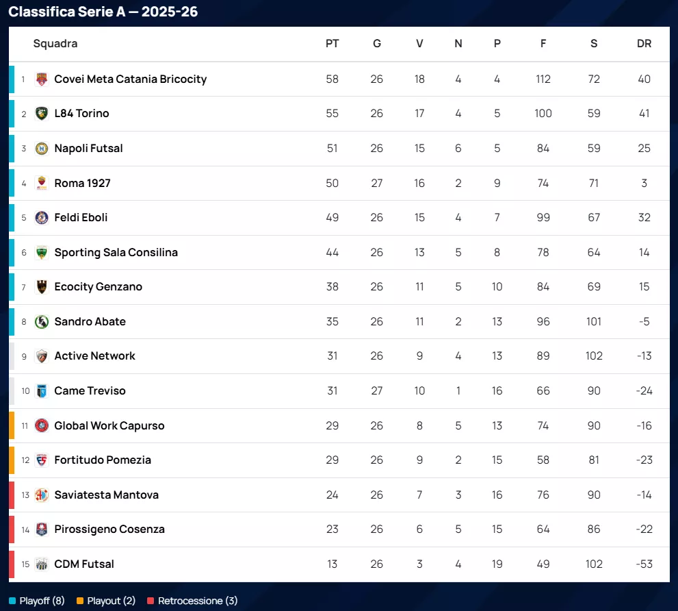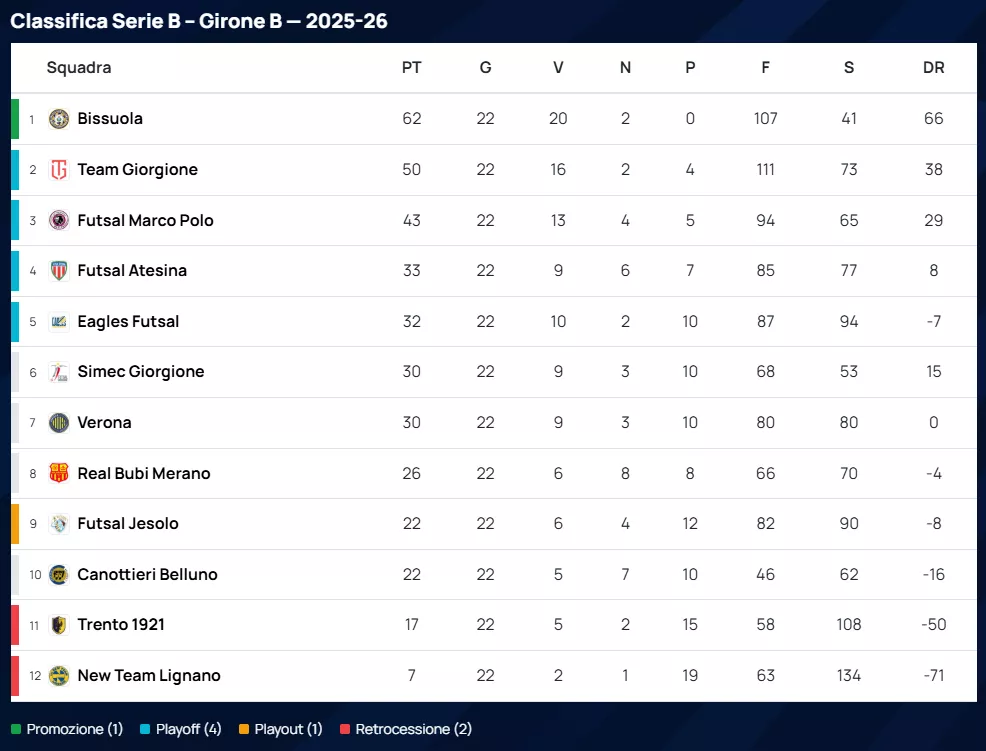 Serie B Girone B: ha già emesso il suo verdetto più importante con novanta minuti di anticipo: il BISSUOLA di Mister Nicola Paglianti è ufficialmente promosso in SERIE A2. Quando manca ormai solo un rintocco al termine della regular season, i numeri celebrano il TEAM GIORGIONE come la squadra con più reti segnate del girone con 110 centri. Sul fronte opposto, il muro invalicabile resta quello della capolista BISSUOLA, che si conferma la squadra con meno reti subite, avendo concesso solo 39 gol alle avversarie.