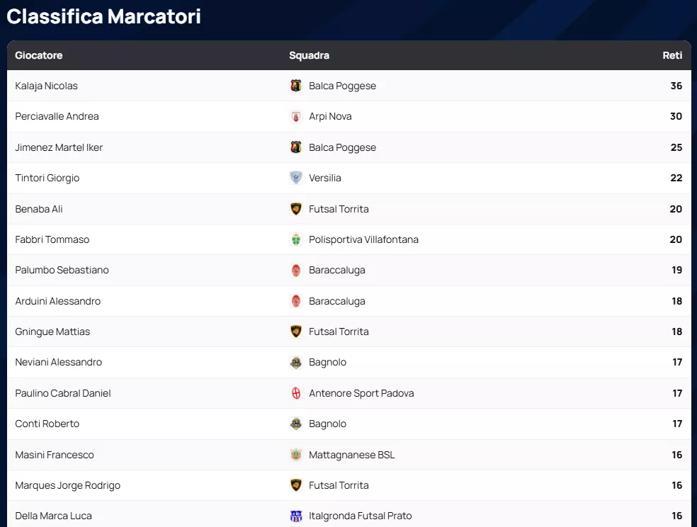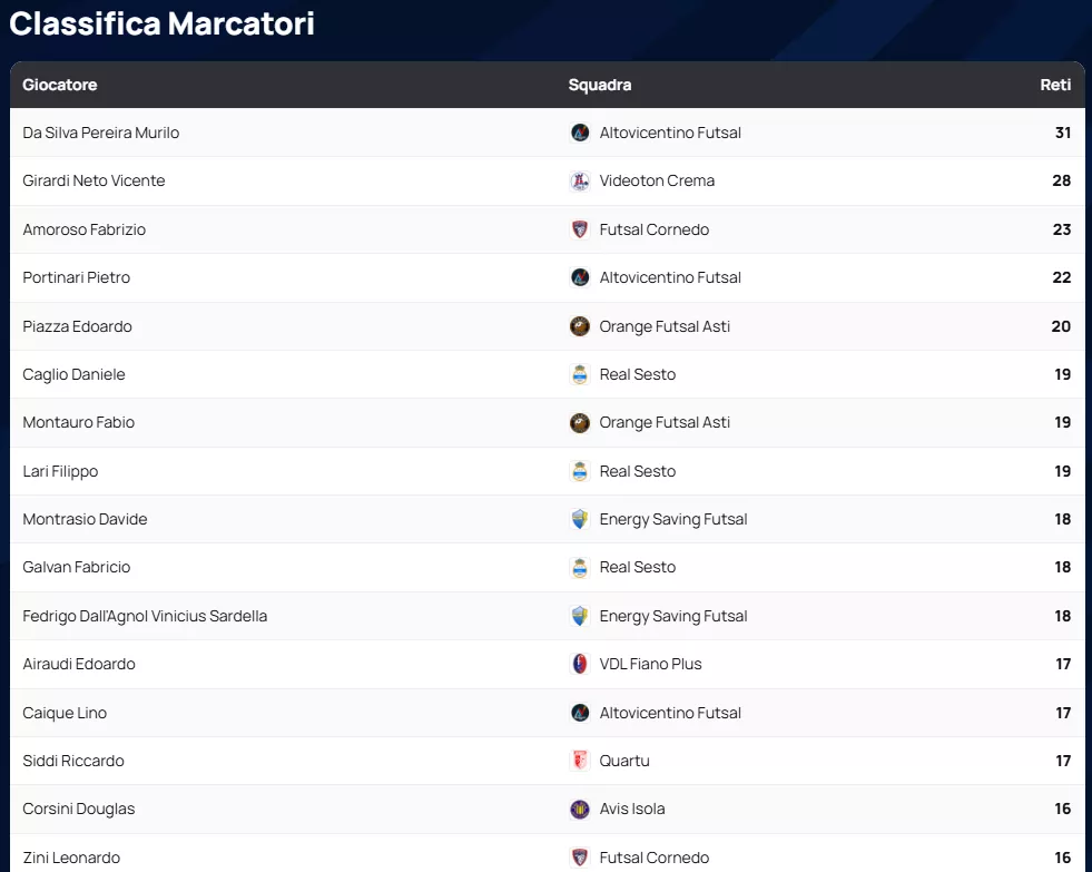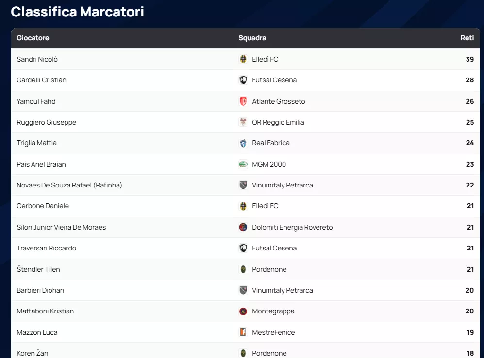 Classifica Marcatori SERIE A2 Élite Gir. A