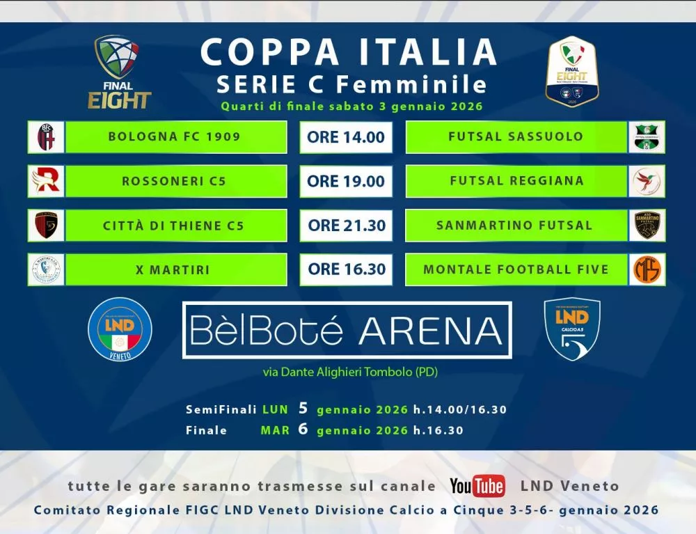 Ai Quarti di Finale parteciperanno le squadre classificatesi ai primi 8 posti del Campionato di Serie C Femminile al termine del girone di andata della Regular Season (per la graduatoria si fa riferimento all'art. 51 delle N.O.I.F.), con questo programma gare definito da Comunicato 35 C5 del 24/11/25