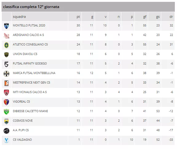 Il MESTREFENICE NEXT GEN C5 (14 pt) ha osservato un turno di riposo sotto la guida di Mister Landi Gabriele. In coda, il C5 VALDAGNO (1 pt) chiude mestamente la classifica, unica squadra a non aver ancora conquistato una vittoria (0 su 11 gare) e con il peggior passivo di reti subite (52), a fronte di sole 19 reti realizzate. Mentre, MITI VICINALIS CALCIO A 5, VIGOREAL C5, DIBIESSE CALCETTO MIANE, COSMOS NOVE e A.A. PUPI C5 se escono da questa “tornata” tutte sconfitte ed ora si ritrovano racchiuse tutte e cinque in soli 2 punti