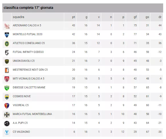 Il Verdetto della Classifica: Ad oggi, l'ARZIGNANO CALCIO A 5 (1° posto) sarebbe promosso direttamente in Serie B. La bagarre per i Play Off (2° al 5° posto) coinvolge MONTELLO FUTSAL 2020 (42 pt), ATLETICO CONEGLIANO C5 (36 pt), FUTSAL INFINITY GODEGO (24 pt) e UNION DIAVOLI C5 (21 pt). In coda, la situazione è disperata per il C5 VALDAGNO (13° posto), attualmente destinato alla Serie C2. La zona Play Out (11° e 12° posto) vede coinvolte A.A. PUPI C5 e MARCA FUTSAL MONTEBELLUNA, ma i distacchi sono talmente minimi che ogni vittoria da qui alla fine varrà il doppio.