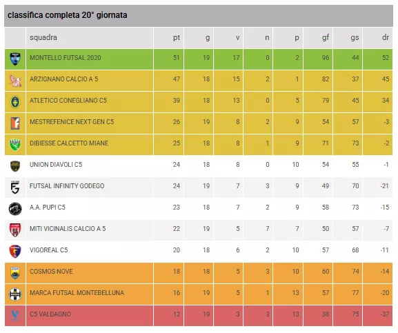 ZONA SALVEZZA E PLAY-OUT: La situazione si fa drammatica per il C5 VALDAGNO (12 pt), che nonostante la vittoria odierna resta fanalino di coda e al momento sarebbe retrocesso direttamente. MARCA FUTSAL MONTEBELLUNA (16 pt) e COSMOS NOVE (18 pt) occupano le caselle dei Play Out, ma la distanza dal VIGOREAL C5 (20 pt) si sta accorciando, rendendo le ultime giornate una vera e propria guerra di nervi.