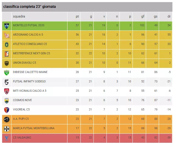 La zona calda è un vero inferno: MITI VICINALIS, COSMOS NOVE, VIGOREAL C5 e A.A. PUPI sono racchiuse in un fazzoletto di punti, in bilico tra la salvezza e il baratro dei Play Out. In fondo, il C5 VALDAGNO occupa la 13ª posizione, mentre la MARCA FUTSAL MONTEBELLUNA sente il fiato sul collo per non essere risucchiata nell'ultimo posto disponibile.