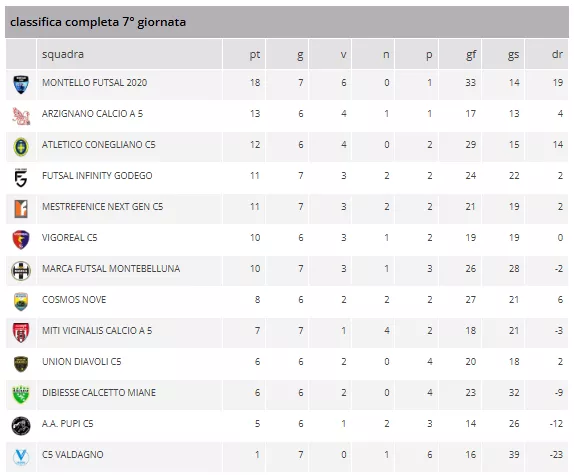 Chiude la classifica, con una situazione sempre più drammatica, il C5 VALDAGNO (1 pt). Un'altra pesante sconfitta, l'unica squadra ancora a secco di vittorie, rende la posizione dei ragazzi di Mister Ranieri Pablo Daniel estremamente critica.