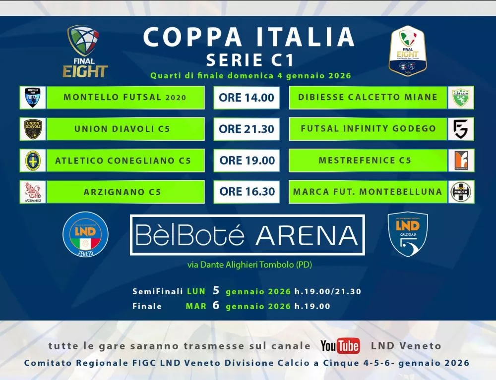 Le “Final Eight” della Fase Regionale della Coppa Italia di Serie C1 si svolgeranno presso il Palasport “BÉLBOTÈ ARENA” di Tombolo (Pd) sito in Via Dante Alighieri, 15.