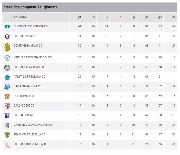 Qualora il CUORE CELTIC VERONA C5 dovesse riuscire a blindare il primato, si aprirebbero ufficialmente le ostilità per i Play Off: il FUTSAL TRISSINO sarebbe costretto a giocarsi l'intera stagione in uno scontro fratricida contro la COMPAGNIA MALO C5, attualmente solida al terzo posto con 30 punti.
