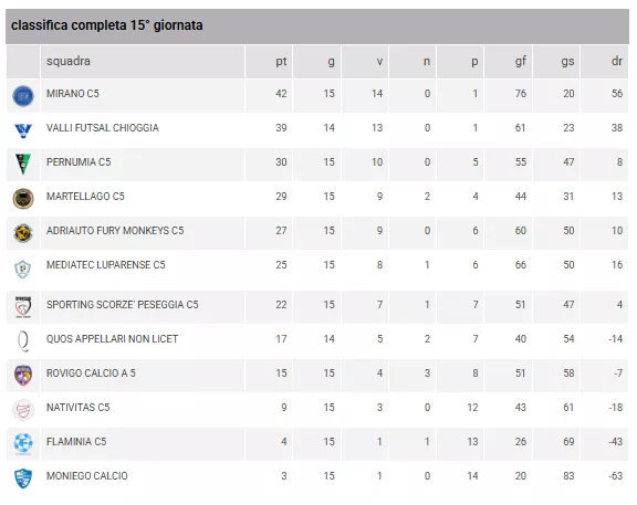 In coda, la situazione si fa critica per lo SPORTING CAERANO CROCETTA C5, ultimo con soli 3 punti. Con la retrocessione diretta in Serie D prevista per l'ultima classificata, la squadra di Caerano dovrà compiere un vero miracolo sportivo.