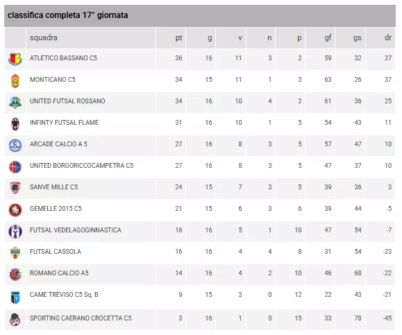 L'ATLETICO BASSANO C5 mantiene la vetta con 36 punti, ma il MONTICANO C5 non molla, restando a -2 (34 punti) con una partita in meno. Proprio il MONTICANO C5 detiene i record statistici più impressionanti: è la squadra con il maggior numero di reti segnate (63) e contemporaneamente la miglior difesa del campionato con sole 26 reti subite.