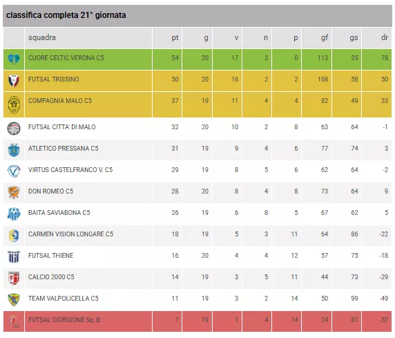 L'Ultima Spiaggia: Il FUTSAL GIORGIONE SQ. B (7 pt) è a un passo dalla retrocessione diretta in Serie D. A +5 dai Castellani il TEAM VALPOLICELLA C5 (11 pt) e il CALCIO 2000 C5 (14 pt) devono tentare il tutto per tutto per agganciare il treno salvezza.