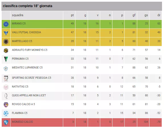 Venerdì sera da incorniciare per il Mirano C5 che non evita la buccia di banana, almeno guardando il più classico dei testa coda in classifica, rappresentata dal Moniego vincendo 1 a 5 prendendosi così la testa della classifica visto le buone notizie in arrivo da Adria. Colledan con una doppietta trascina i suoi nel primo tempo, a segno anche Bassich, Biagiola e Soncin. Il Moniego aveva trovato il goal ad inizio partita con Peng, situazione di classifica insomma disperata per gli uomini di mister Pastrello e Rossi. Curiosamente tutti i goal della sfida sono avvenuti nel primo tempo.