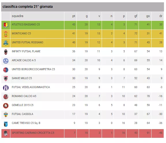 La ventunesima giornata del campionato di Serie C2, Girone C, giocata venerdì 27 febbraio continua a regalare emozioni e dimostra quanto è equilibrato il girone soprattutto nella parte alta della classifica dove non c'è una vera e propria squadra in grado di scappare e rendendo queste ultime giornate ancora più avvincenti. ATLETICO BASSANO, MONTICANO C5 e UNITED FUTSAL ROSSANO occupano le prime tre posizioni e sono racchiuse in 4 punti di distanza. Dietro il FUTSAL VEDELAGOGINNASTICA batte il GEMELLE 2015 nello scontro diretto ed esce dalla zona playout. Sono 40 le reti realizzate in questo turno di campionato.