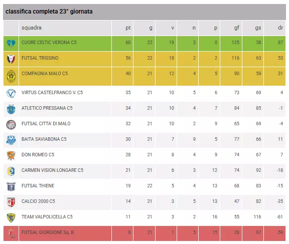 La 23ª giornata del campionato di SERIE C2 Veneto – Girone A consegna un turno ricco di emozioni, conferme e scossoni, mentre il traguardo della regular season si avvicina con sole tre giornate ancora da disputare. In testa, il CUORE CELTIC VERONA C5 continua a dettare legge con numeri da capolista assoluta: miglior attacco del campionato (125 gol) e miglior difesa (38 reti subite), un dominio tecnico e mentale che nessuno è riuscito a scalfire. Alle loro spalle, il FUTSAL TRISSINO mantiene il passo, mentre la corsa playoff tra COMPAGNIA MALO C5 e VIRTUS CASTELFRANCO V. C5 si fa sempre più intrigante, con il regolamento che incombe: se il distacco tra seconda e terza sarà ≥ 7 punti, il playoff non si giocherà. In coda, la situazione è drammatica: il FUTSAL GIORGIONE Sq. B resta in zona retrocessione diretta, unica posizione che quest’anno porta in Serie D, mentre il TEAM VALPOLICELLA C5 e il CALCIO 2000 C5 non riescono a trovare continuità.