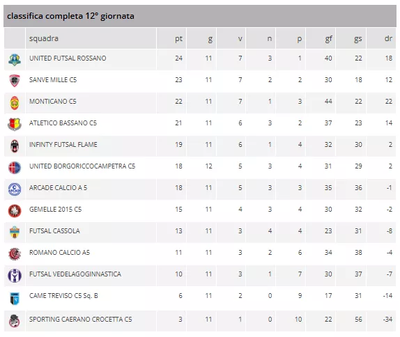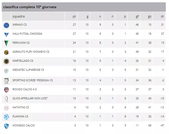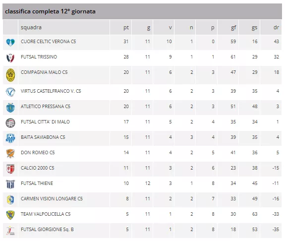 La classifica vede il TEAM VALPOLICELLA C5 e il FUTSAL GIORGIONE Sq. B (entrambi a 5 pt) a chiudere la graduatoria, in piena zona retrocessione, con il TEAM VALPOLICELLA C5 che detiene il peggior passivo difensivo (63 gol subiti).