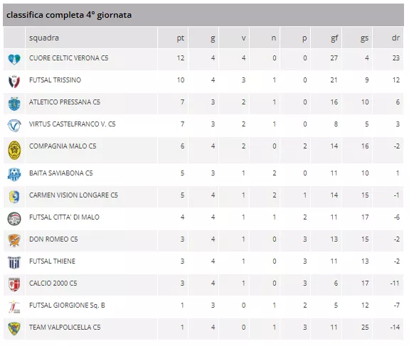 Ha scontato il turno di riposo il Baita Saviabona di Mister Nicolas Zeppa, che tornerà di scena nella quinta giornata sul campo del Calcio 2000. Il Match di cartello però quella sera sarà quello del Consolini di Verona, dove la capolista Cuore Celtic ospiterà la seconda in classifica Futsal Trissino. Importante match anche quello tra Atletico Pressana e Dom Romeo C5 con molti ex da un lato e dall'altro. La Compagnia di Malo ospiterà la Virtus Castelfranco, mentre al Centro Giovanile di Malo ci sarà il Derby tra Città di Malo e Futsal Thiene. Carmen Vision Longare di scena invece sul campo del Futsal Giorgine sq. B.