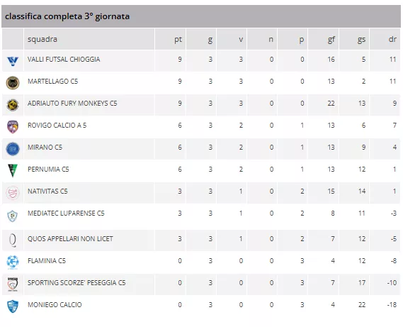 Classifica con VALLI CHIOGGIA, ADRIAUTO FURY MONKEYS e MARTELLAGO a quota 9, ROVIGO, MIRANO e PERNUMIA a 6, a quota 3 NATIVITAS, MEDIATEC e QANL, a quota 0 FLAMINIA, SCORZÈ e MONIEGO. Rapido sguardo ai marcatori, con Nicola Tiozzo Pagio (Adriauto) e Nicola Scandagliato (Mirano) a quota 6 leader della classifica.