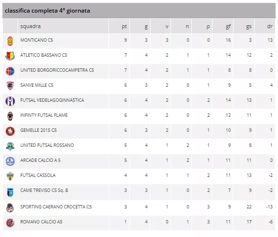 Venerdì 10 ottobre si è disputata la Quarta Giornata del Girone C del Campionato Regionale di Serie C2 2025/2026 dove il fattore campo è stato determinante in 5 partite su 6. Nonostante il turno di riposo già fatto il MONTICANO C5 si porta al comando in solitaria con tre vittorie in altrettante partite di campionato. Dietro ATLETICO BASSANO e UNITED BORGORICCO CAMPETRA seguono con due punti di distanza. In fondo alla classifica troviamo CAME TREVISO SQ.B e SPORTING CAERANO CROCETTA a 3 punti e il ROMANO CALCIO A 5 con 1 punto. In questa giornata sono state siglate 37 reti, 20 dalle squadre di casa e 17 da quelle in trasferta.