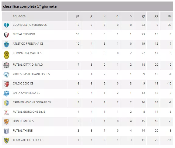 La Quinta Giornata del campionato di Serie C2 Girone A, giocata Venerdì 17, ha ribadito il dominio assoluto del CUORE CELTIC VERONA C5 e ha rimescolato le carte nelle posizioni immediatamente successive. Tanti gol, qualche rimonta e una classifica che, a parte la capolista, si fa sempre più compatta e avvincente.