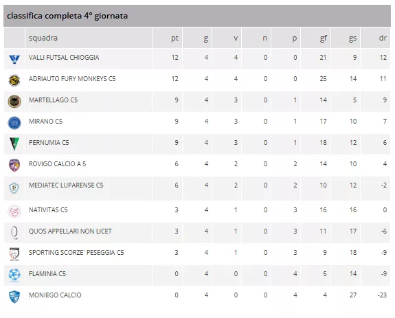 In classifica duetto ADRIAUTO FURY MONKEYS e VALLI CHIOGGIA a quota 12, a quota 9 inseguono MIRANO, PERNUMIA e MARTELLAGO. ROVIGO e MEDIATEC a quota 6, mentre a 3 SCORZÈ, QANL e NATIVITAS. Chiudono a 0 FLAMINIA e MONIEGO. Nei capocannonieri rimane avanti Nicola Tiozzo Pagio (Adriauto) che sale a 7, grande balzo di Nidal Zakouni (Valli Chioggia) che raggiunge Luca Scandagliato del Mirano a 6. A quota 5 sale Riccardo Boscolo Gnolo (Adriauto), che raggiunge Roberto Rosca (Rovigo) e Nicola Salviato (Martellago) che non hanno segnato in questa giornata.