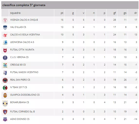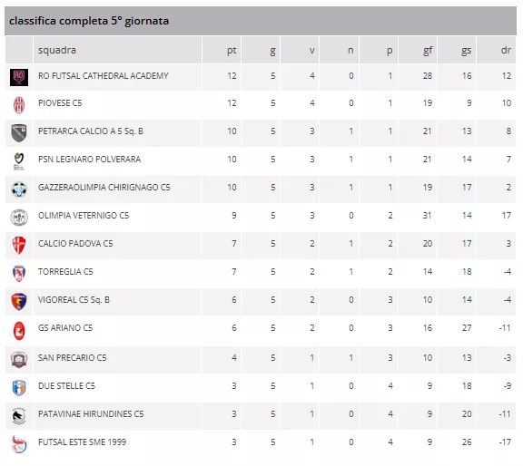 Con questi risultati, la RO FUTSAL CATHEDRAL ACADEMY e la PIOVESE C5 volano in testa con 12 punti, seguite a strettissimo giro da un terzetto a quota 10: PETRARCA CALCIO A 5 SQ. B, PSN LEGNARO POLVERARA e GAZZERAOLIMPIA CHIRIGNAGO. L'OLIMPIA VETERNIGO C5 si insedia in sesta posizione.